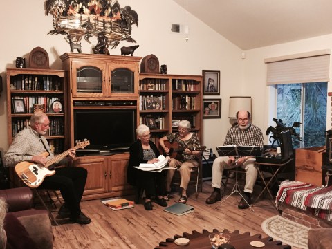 What a fun night. Georgia and Vela (my mother’s sisters) singing their Hillbilly tunes, one harmonica player, who also sang with the most beautiful voice I have heard in a long time. His voice reminded me of George Beverly Shay who was a voice from the long ago past. There was also a base guitar player that added a lot to the ensemble. Not only did Georgia and Vela sing they pulled in aunt Annie in too (another sister of my mom). Their voices harmonize beautifully together. It was especially fun when Vela did the chicken dance. I’ll see if I can upload a video. Well, I tried to post the video and it did not work.