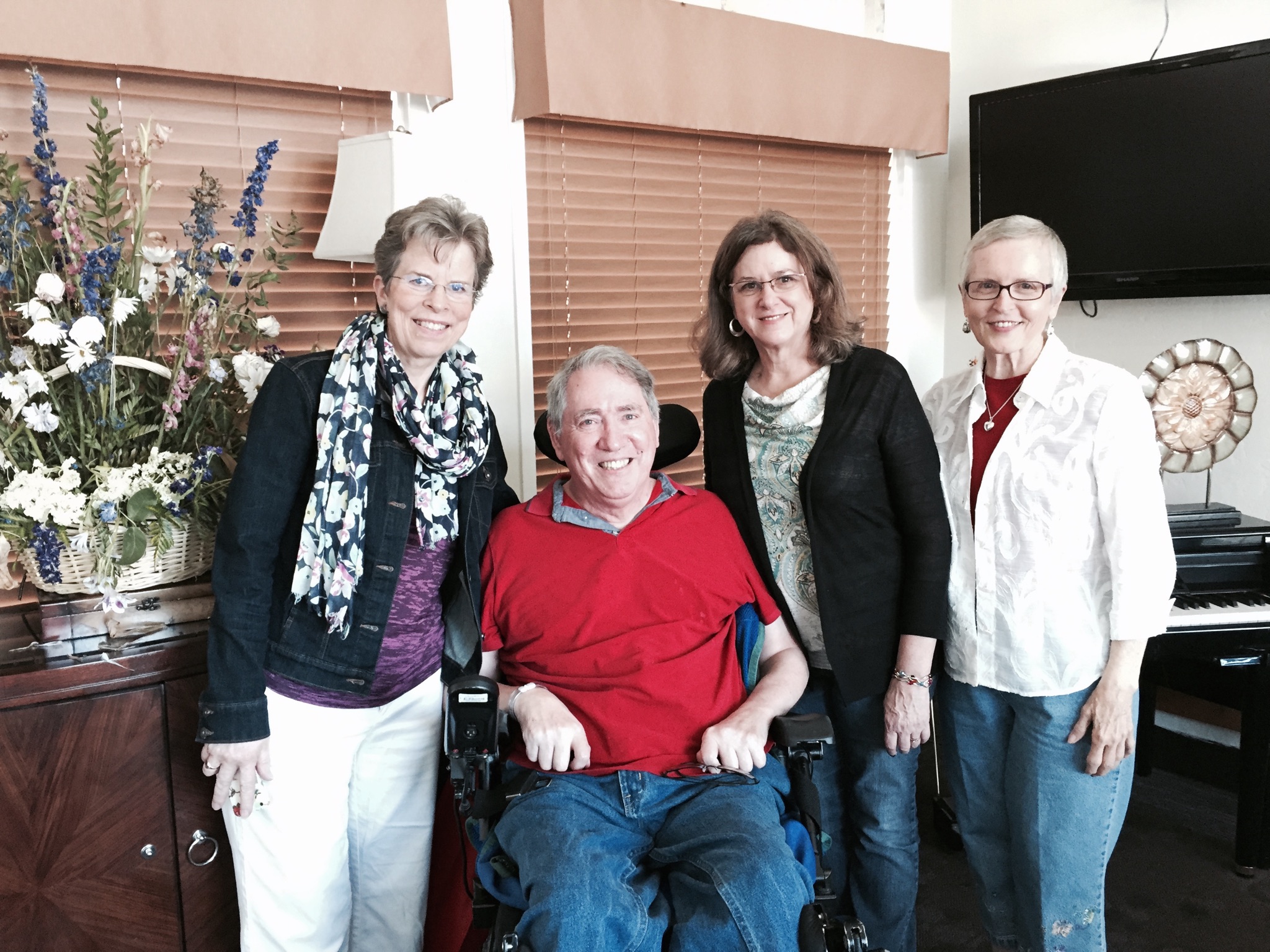 Sue from last week’s travels met us after the brunch at Jeanette’s house. We all made a nice lunch and had a great time. I met Sue while attending college. She has a brother named Jack that made us a threesome. He is the kind of guy that everyone loves. Twenty five years ago Jack was diagnosed with ALS. Because he outlived most ALS patients his illness was diagnosed and re-diagnosed and pondered and studied. Some doctors call his illness PLS, others disagree. PLS is essentially the same as ALS but with a longer life span. Well Jack has definitely outlived most patients. He is paralyzed and his limbs do not work. He is still able to eat a few things and swallow. He loves the Lord and has an attitude that is puzzling, not only to the doctors but to those around him. Jeanette, Sue, and I drove over to see him this afternoon. What a delightful time to be in his presence. He was even able to talk a bit, though haltingly, and with great pauses. There is absolutely nothing cloudy or foggy about his mind. He kept bringing up memories the rest of us had already forgotten years ago. It was interesting being with him because even in his debilitated physical state he was still trying to boss me around WHILE I WAS TAKING THE PICTURES! He was instructing everyone where He wanted them to stand for the photo session. I guess I lost control of that photo session. I did what he said. I may never see Jack again in this world but old memories have been revived and not only did I get to talk to him he was able today to talk to me. Sue said he is often not capable of speech. I felt another blessing added on top of my basket. God is so good. Someday Jack will dance before the Lord!