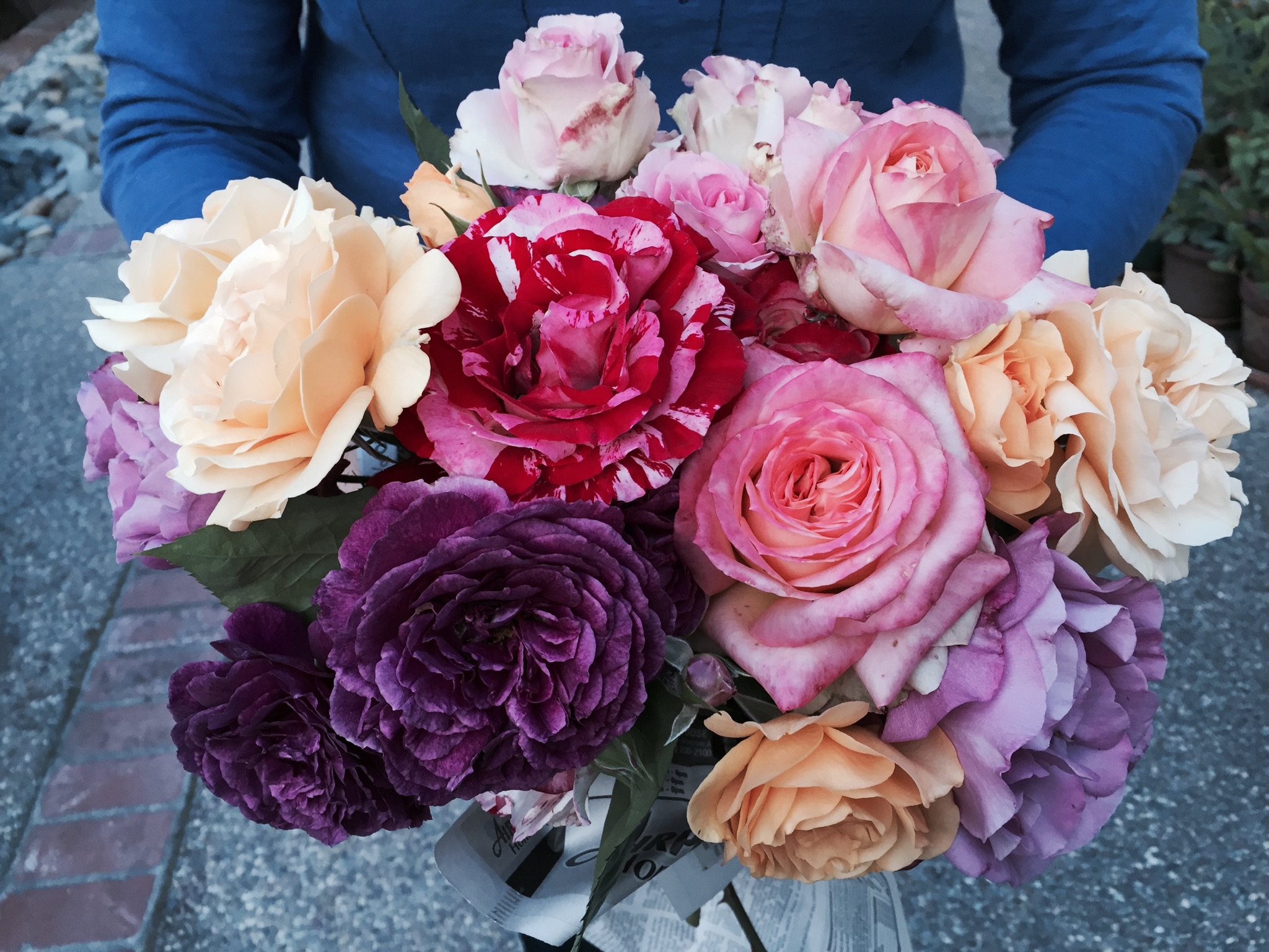 I told Jeanette this morning that I wanted to stop in some of the yards in the neighborhoods around here and just pick one rose from each bush (especially at one house I drive by everyday). I told her I would love to have a boquet of the beautiful roses I see. They are so huge and diverse in color, style of blooms, sizes, and smells. When I was admiring Ron’s rose garden he said I could pick any I wanted! WOW! WOW! WOW! There it was again! God just giving me another desire of my heart! Linda came out with the clippers and kept encouraging me to cut more. In the photos I posted I included the bouquet I brought back to Jeanette’s from their backyard. They sit regally in a vase behind me in the office where I am writing and the fragrance mixture of all the varieties smells like a lush wonderful fruit drink of some sort. Sort of lemony and subtle and yet spicy all in one inhalation. I shall sleep with them in my room and then place them in a communal area for all to enjoy while I am gone tomorrow. Perhaps I’ll even take one to each of my sisters whom I will see tomorrow. That is…if I can part with two.