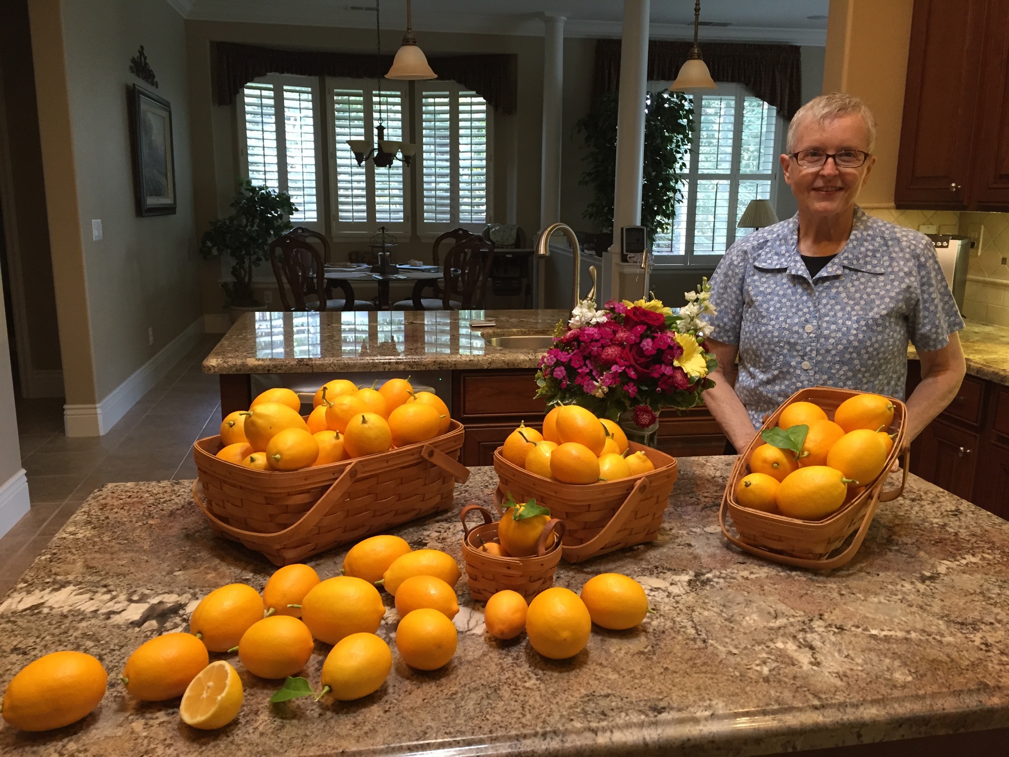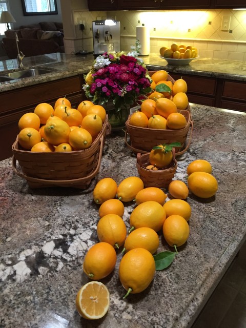 I did go to the gym and when I came home I braved the post rain back yard and tackled picking lemons. Yes, I said lemons. If I had to guess I would say her Meyer lemon tree probably had 500 lemons on it. And let me tell you, this lemon tree fought back. It had great big, long, sharply pointed, strong, THORNS. I mean they were like weapons and extremely sharp! Ask me how I know! “Ouch”! I wore long sleeves which helped but still had a few pricks elsewhere. I picked lemons for a half hour or more. After they were washed and dried and laid out I counted 80 lemons on the counter and in a bowl was about another dozen or so.