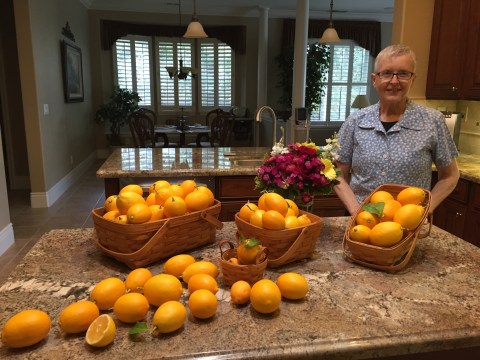So, the photographer in me just knew there was a picture waiting to happen. Paulette pulled down her beautiful baskets from the pantry and we loaded the lemons into them. I arranged them in what I thought a was nice display and we not only took pictures, but, we did a talking video. We had fun doing it. I took some to the gym this morning, which I had picked yesterday, and gave them away to the people I spoke with yesterday. Tomorrow I will take more. I also plan to take them with me as I leave and hand them out to wherever I go to whomever wants them. They are quite sweet lemons or could be mistaken for a very sour orange. They look more like oranges, both outside skin and inside flesh. This is a very forlorn tree. It is sad because it is neglected and left to its own devices. I heard the lemons calling out to me to please pick them so they could fulfill the destiny that God had intended for them. That destiny was to be picked, eaten, and enjoyed, while giving rich nutrients to to those who ate them. The picked lemons are happy lemons! And I am quite happy for picking them, as well as helping them fulfill their destiny! I called ahead and told Joyce I would be bringing lemons. She said she had two lemon trees and didn’t need any lemons. Oh well…Wish I could get them to my sister Velma. She is the lemon lady!