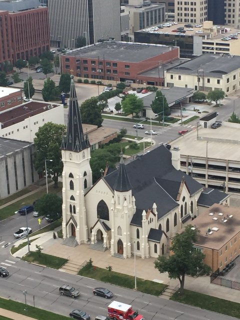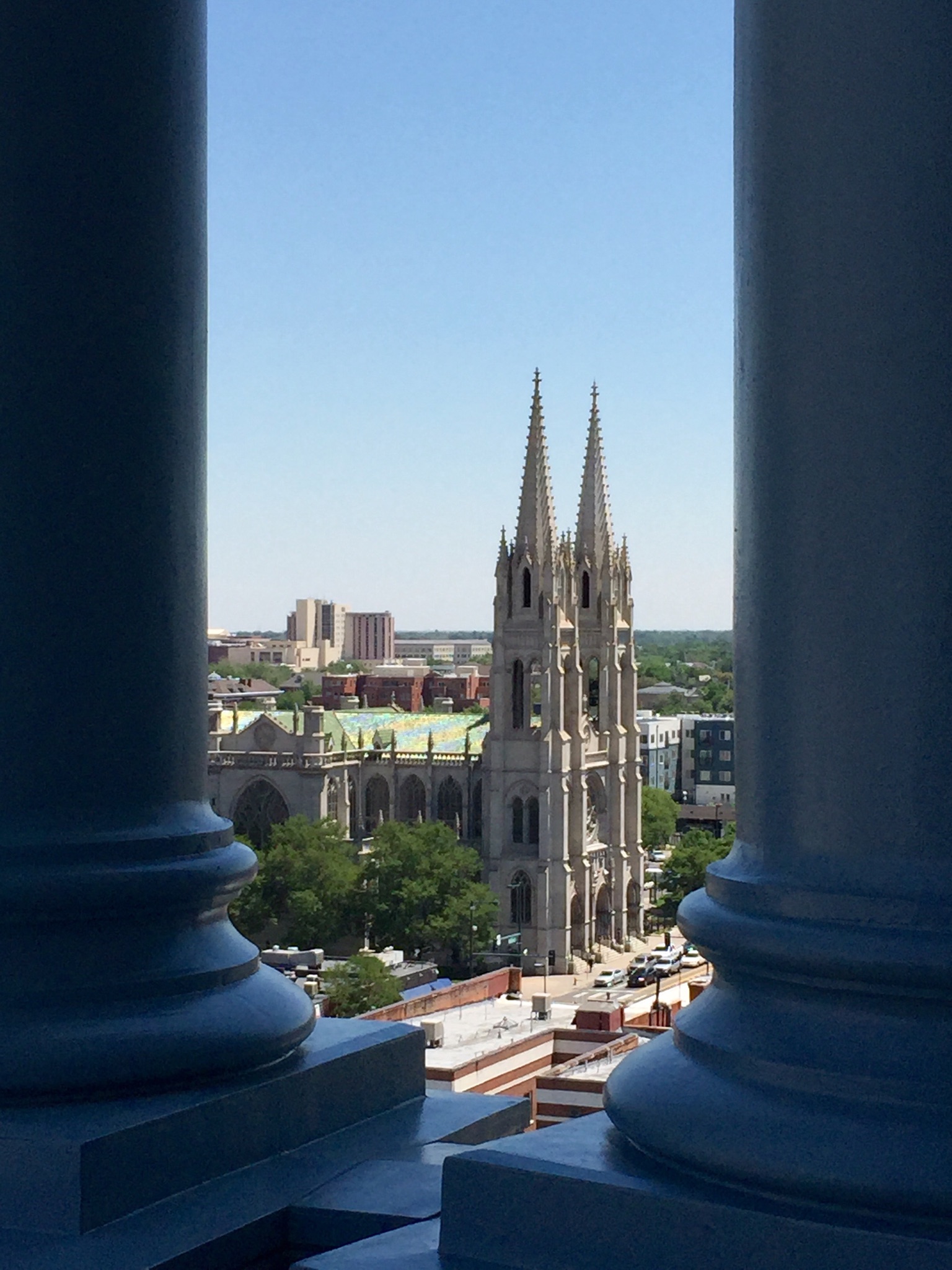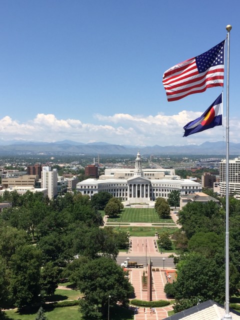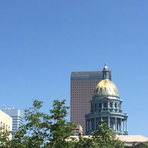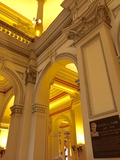 I will tell you that the Denver Capitol allows visitors a tour up into the dome of the building. The dome rises 272 feet above ground and is covered in real gold. It took 200 ounces of gold to gild the dome when it was originally built. In 2013 it had to be gilded once again and because of new techniques it took only 64.5 ounces. Except for the brass and wood in the capitol building everything else was harvested from Colorado. All the granite, onyx, and marble were from the mountains of Colorado. The people of Colorado felt it was important to use local supplies even though it would have been less costly to order the marble from Italy. I was amazed at the beautiful, one of a kind marbles they used. Some of the marbles were literally used completely up. There wasn’t even enough to finish some of the areas originally designed for it. I took some photos and will include them when I can get online. As I write I am unable to access the internet but perhaps I will be able to have service tonight. It is only 4:24 p.m. and I am writing now so I can go to bed early tonight because I have a long drive day to Lincoln Nebraska and I need to leave very early. I thoroughly enjoyed the tour today and only wish I could have toured Cheyenne’s Capitol yesterday since I was right there on the premise. I will also include a photo of the City and County building that I took from the outside height of the dome on the capitol. I walked up and up and up forever to get there. I had to do it slow as not to go into Atrial Fib. This high altitude does a number on my heart rate. I just took it slow and rested a couple minutes when I needed to. Some people in the tour could go to the top. I am so glad I was still able to do so.