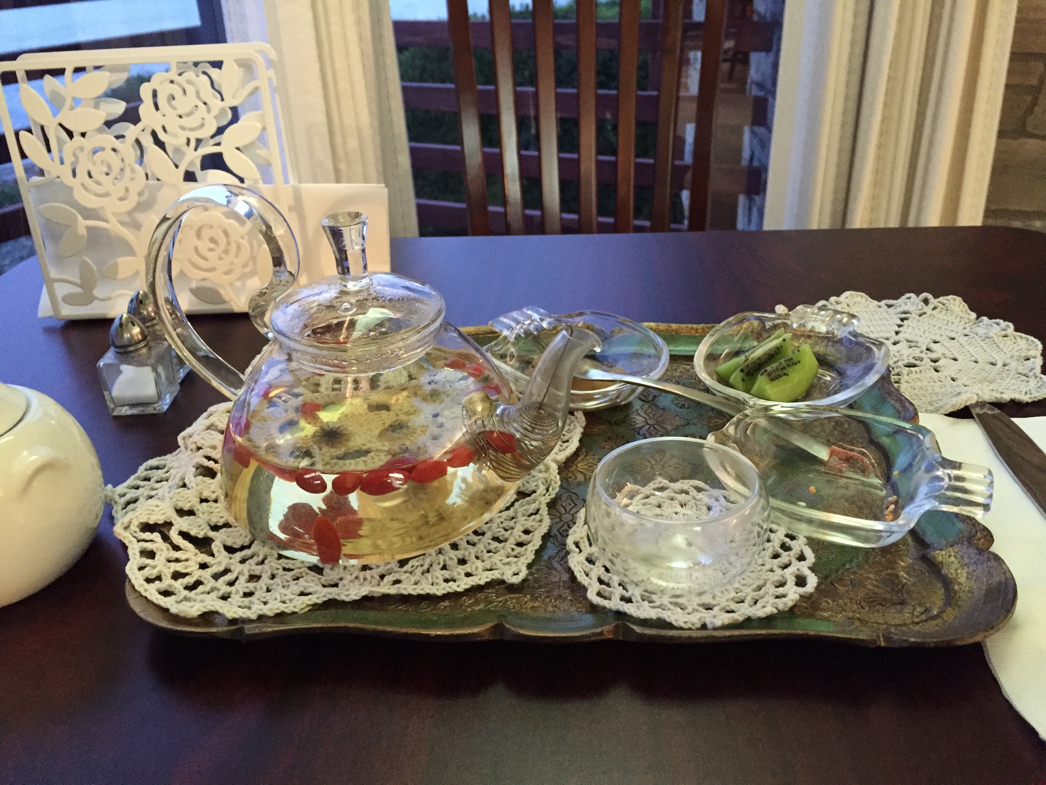 Morning with Annie and Richard was wonderful. No other way to describe it. They prepared an official Chinese breakfast which I have have included in picture form. Unbelievable. The presentation was beautiful. The surroundings were so peaceful and calm, and the view was amazing. I shared a table with the other guest there, Tammy, Tommy, and their daughter Kayla. A beautiful God loving family from the south. I had a little trouble understanding their accent as I have been out of the south too long but finally understood everything that was being said. Loved the company and conversation.