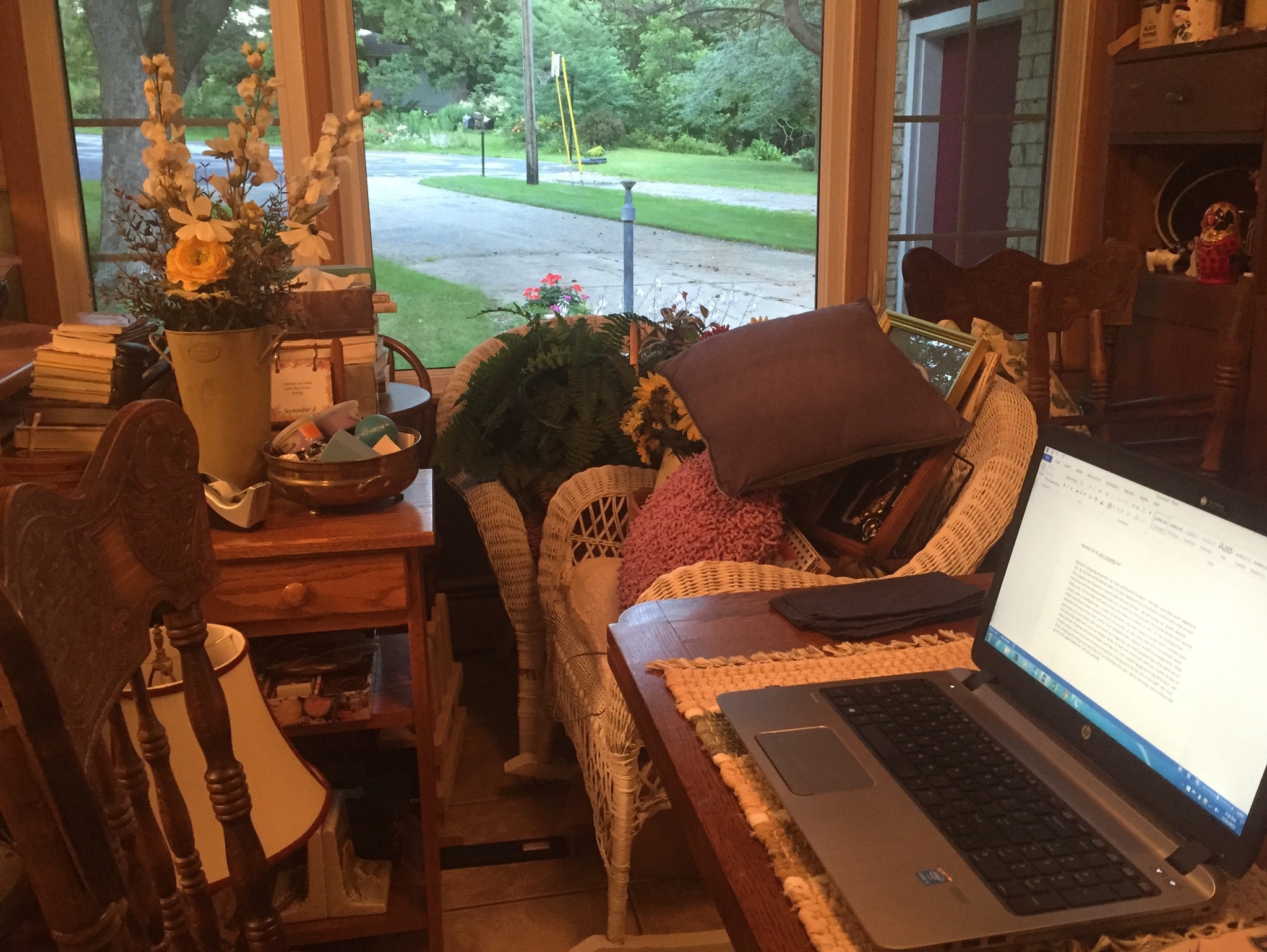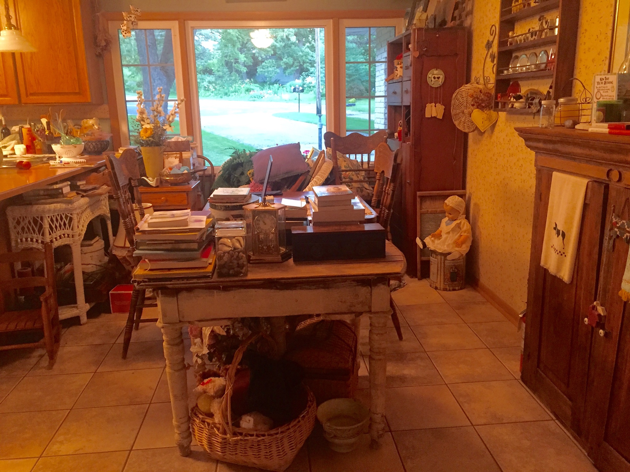 But we’re not going anywhere! Or, have we become hoarders? Oh God, I pray that never happens to me. As I sit here at the kitchen table, (I’ve been displaced from my kitchen counter) and I look around me, it appears that hoarders is exactly what we have become. We are having our carpets cleaned tomorrow and everything possible had to be moved from the sunroom, the formal dining room, and the living room. All the small stuff which means the things on surfaces as well. I’m here looking at two wicker chairs, a hardback chair, a small, but tall table, a humidor, lamps, a wicker shelf, a wooden plant stand, two kitchen chairs stacked on top of one another, an old rickety table that most people would probably not keep in their barn, pretty round stackable boxes, baskets, and floral arrangements, clocks, and books and more books and more books and magazines, and desk paraphernalia (that which sits on the old rickety table that I use as an antique desk), do dads and nick knacks with four months of dust on them and lots of pillows and more baskets and fake ferns and wandering Jew and a big dictionary. Lots of other places in the house are serving as temporary resting places for the rest of the stuff. We must finish emptying the living room and then do our dressing room also. All the dressing room furniture will go into the spare bedroom. We are packed up for the carpet cleaners! One good thing I am happy about. Before I left on my trip I gave all my living plants away to a friend of mine. She has a way with making plants just want to live. Mine were some pretty big ones. She told me I could have them back when I returned but I think I like the empty spaces.