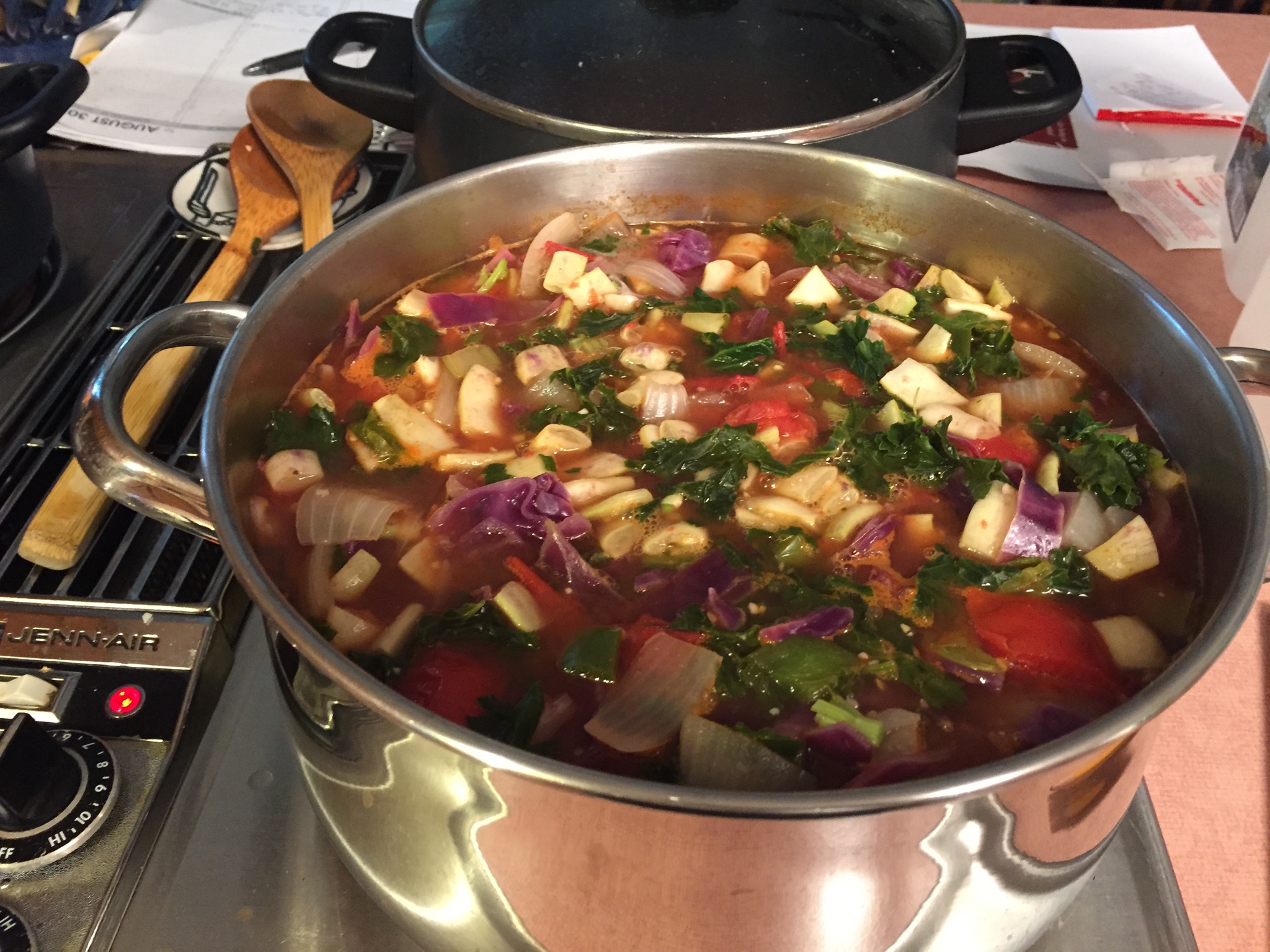 I did not have anyone offer me anything extra to put in my pot but I just kept adding to the pot myself. I first started making the soup in my 6 quart Nesco Cooker. I quickly realized it was not going to fit so I had this hot steaming mass and had to get a bigger pot to pour it into. I put the bigger pot into the sink and emptied the partially made soup into it. I kept adding to the pot and later realized that the second pot was also not going to hold everything from the fridge. So out came pot number three, my stock pot. If you know what a stock pot is you will be impressed to know that by the time I was finished it was over ¾ full. By the time it was finished it had over 7 quarts of homemade chicken broth, two cups of V-8 juice, 6 tomatoes, and all the liquid that cooks out of the vegetables. These are the vegetables I remember using, 3 large onions, garlic, celery, carrots, beets, beans, 4 ears of fresh corn, half head of purple cabbage, zucchini squash, 4 peppers, kale, and I’m sure there is something I am forgetting. I topped it off with two pounds of black beans and a pot of cooked Quinoa. And now you know why my day went to the pots.