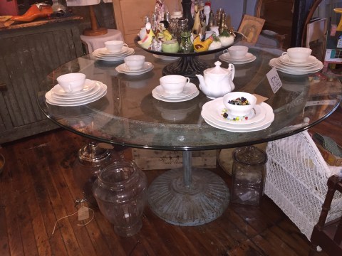 It was a little bit more than just looking around today. First I had lunch at the Brat place (a vegetarian grilled sandwich) and then went over to THE COTTAGE GODDESS to look around. Low and behold, amidst all the clutter of beautifully displayed artifacts was a glass topped table with a base like I’ve never seen before. It was amazing. Since we passed down our heirloom dining room set to our son and his wife, we have been tableless in our formal eating area. I’ve had my heart set on a round glass table but didn’t like any of the styles I have seen in resale shops. I pretty much only buy resale items. I like to recycle too! Well, there it was sitting a pretty as you please, covered with dust and dirt and dishes and a stacking tray full to the top with do-dads of every unimaginable kind. Through the glass I saw a circular tray-like base that was just a bit smaller than the glass. It was old and worn and had a beautiful patina of crusty metal with chipped paint fragments. It was amazing. It stands on one pedestal with a wide base that meets the floor. I actually took a picture while in the store to send to Dave and I will post it below this blog. A picture is worth a thousand words.