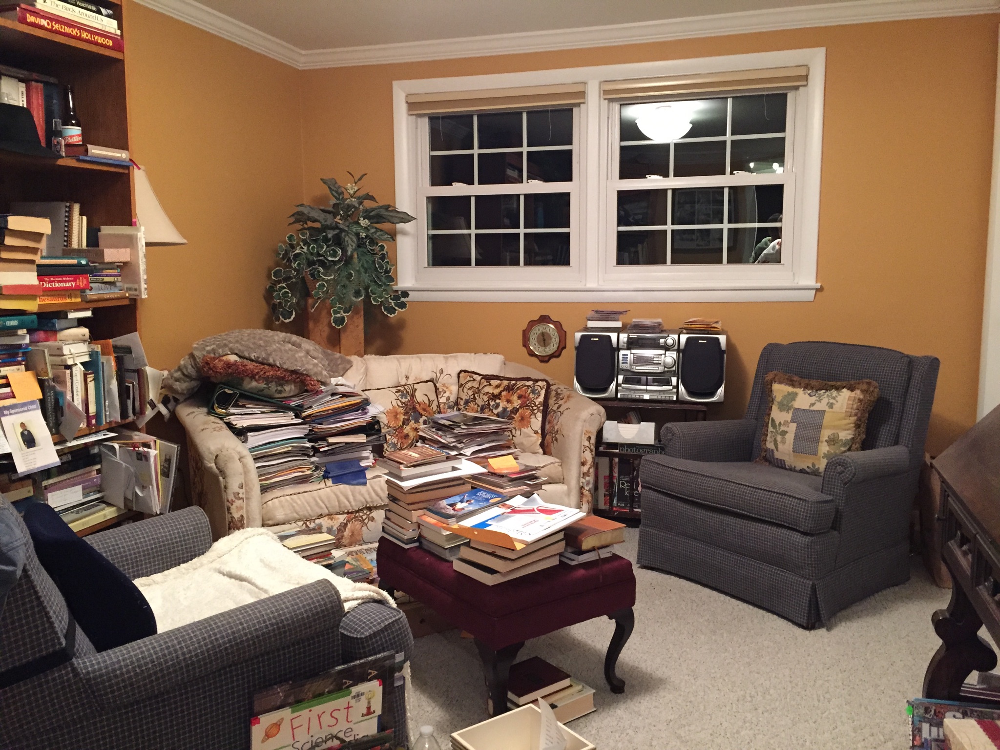 It is a bit late for me to start writing a blog so I will make it short and sweet. I notice, since I have been home and not yet on a routine, it seems my blog substitutes for my journal. But…today I was able to uncover my “journaling chair” in my library. So many books had been dumped in there that I could hardly get into the room. They are now dispersed here and there around the house where I will use them, some put in the closet, others tucked in nooks and crannies here and there, and now I can actually sit down to write in my library. I also uncovered the chair across from me so my friend Betts will have a place to sit. It’s my favorite room. I have everything important at my finger tips.