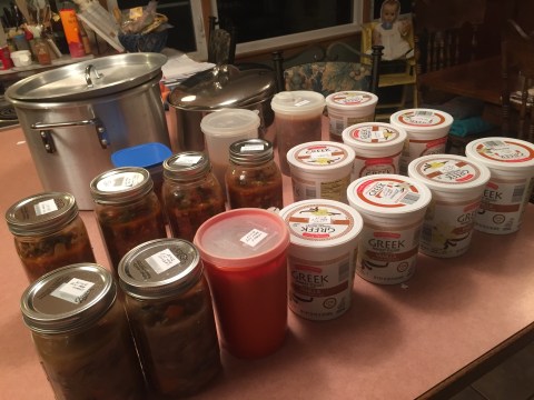 Sunday is Sabbath Sunday but Saturday is Sacred Saturday! Sacred to me because I choose to do whatever I want to on this day. That is a new and trilling experience! I awoke with a plan to start sorting my office and cleaning it up but rapidly changed my mind as the course of my day changed. The first change was realizing just how exhausted I was from working so hard yesterday. When it was all said and done we did not go to bed until Midnight! I worked a couple of hours on the blog last evening while Dave cleaned the kitchen. We were also waiting for the food to cool as I do not put hot jars in the refrigerator, nor warm jars in the freezer. We ladled everything into the containers I came up with and the liquid was still slow to cool. Finally the non-glass containers cooled enough to be put into into the freezer and the warm glass jars were put in the fridge. They were transferred to the freezer this morning. The inside of my fridge looks so nice and sparse. My fridge has a very temperamental personality. In the center back, on each shelf there are vents for circulation and cooling of air. Absolutely nothing can be placed in the middle third of my fridge without freezing the back half of the fridge’s contents and warming the front half of the fridge. It is a Maytag, three doors, with the bottom drawer being a pull-out freezer compartment. I found out about another person who has a refrigerator exactly like mine and has the exact same problem as I do. That is a bad design as far as I am concerned. I used to be a Maytag user but I will never buy another Maytag product since they are no longer truly Maytag, but built by a different company.