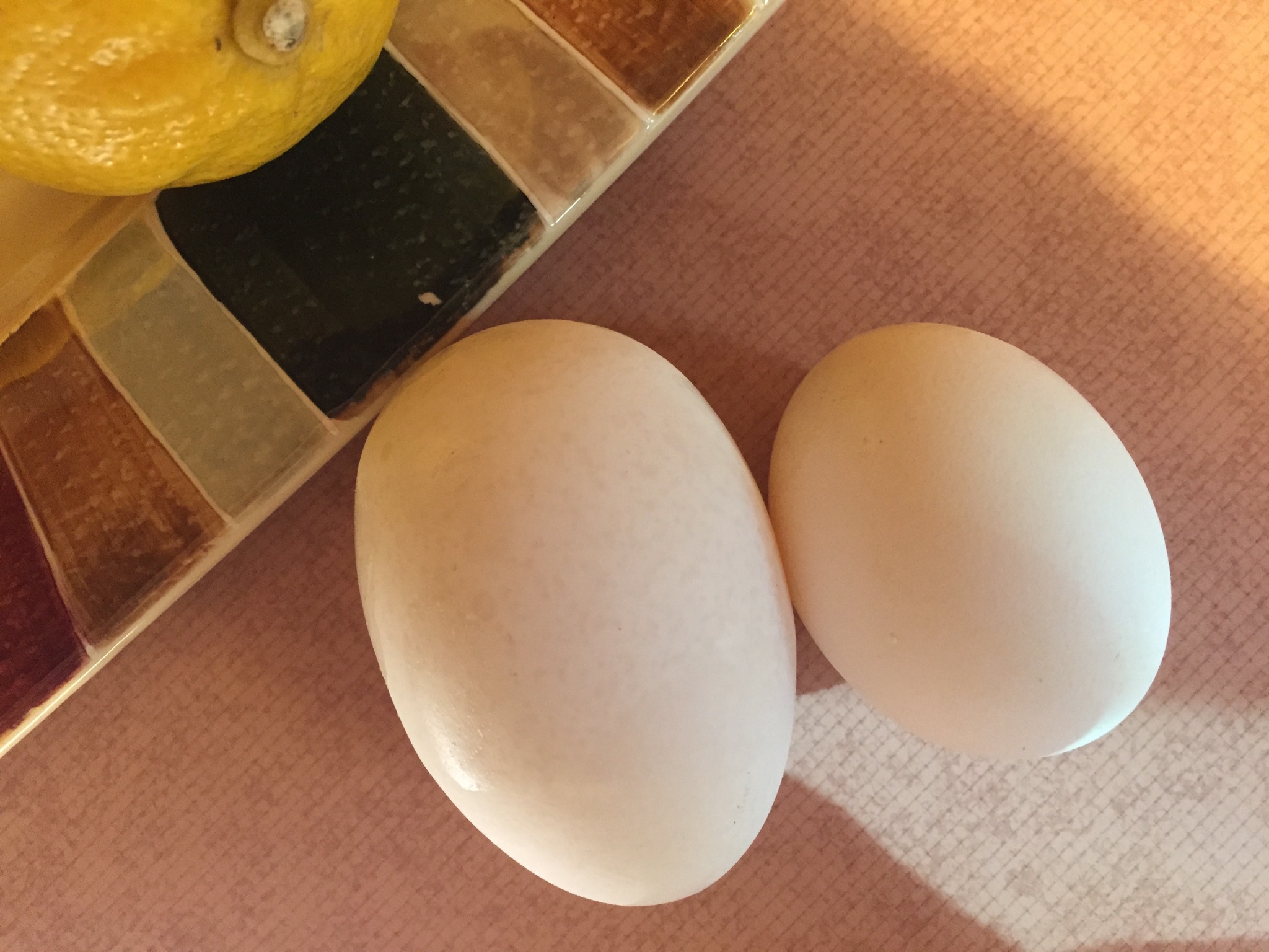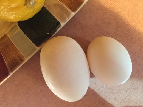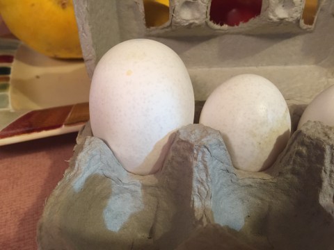 Now, let’s skip to the egg. Think of the egg as just a product of the chicken (not f_ _d). Remember I am not saying that word anymore. I opened a carton of farm fresh eggs we buy and my eyes popped out. Eleven normal size eggs tucked neatly in the carton and one egg that stuck out like a sore thumb. I imagine there was something else quite sore after laying that egg. Look at the picture below. Dave asked if it was a goose egg. I will say, it was a good egg! Just thought you might like to see how big it really was.
