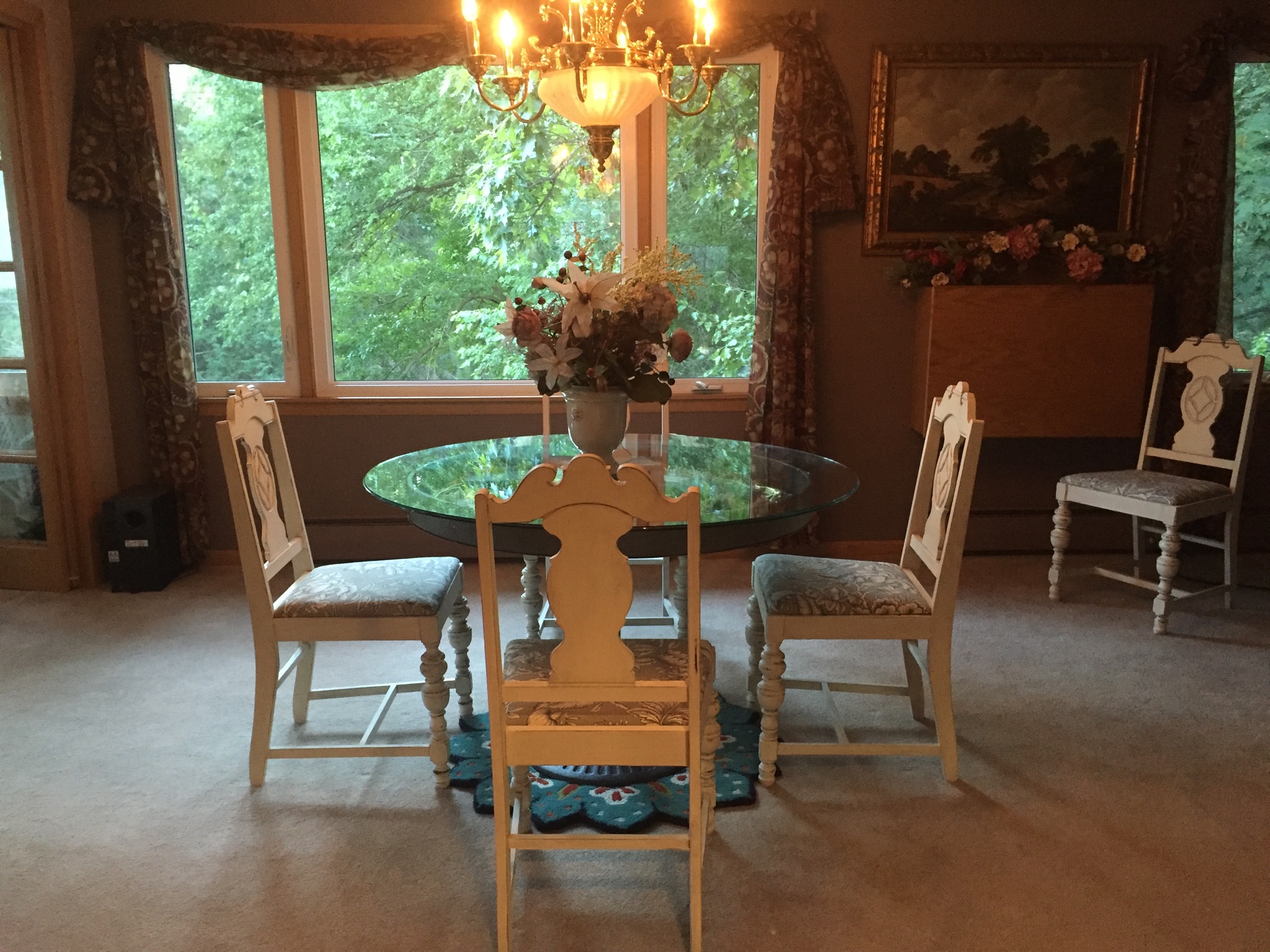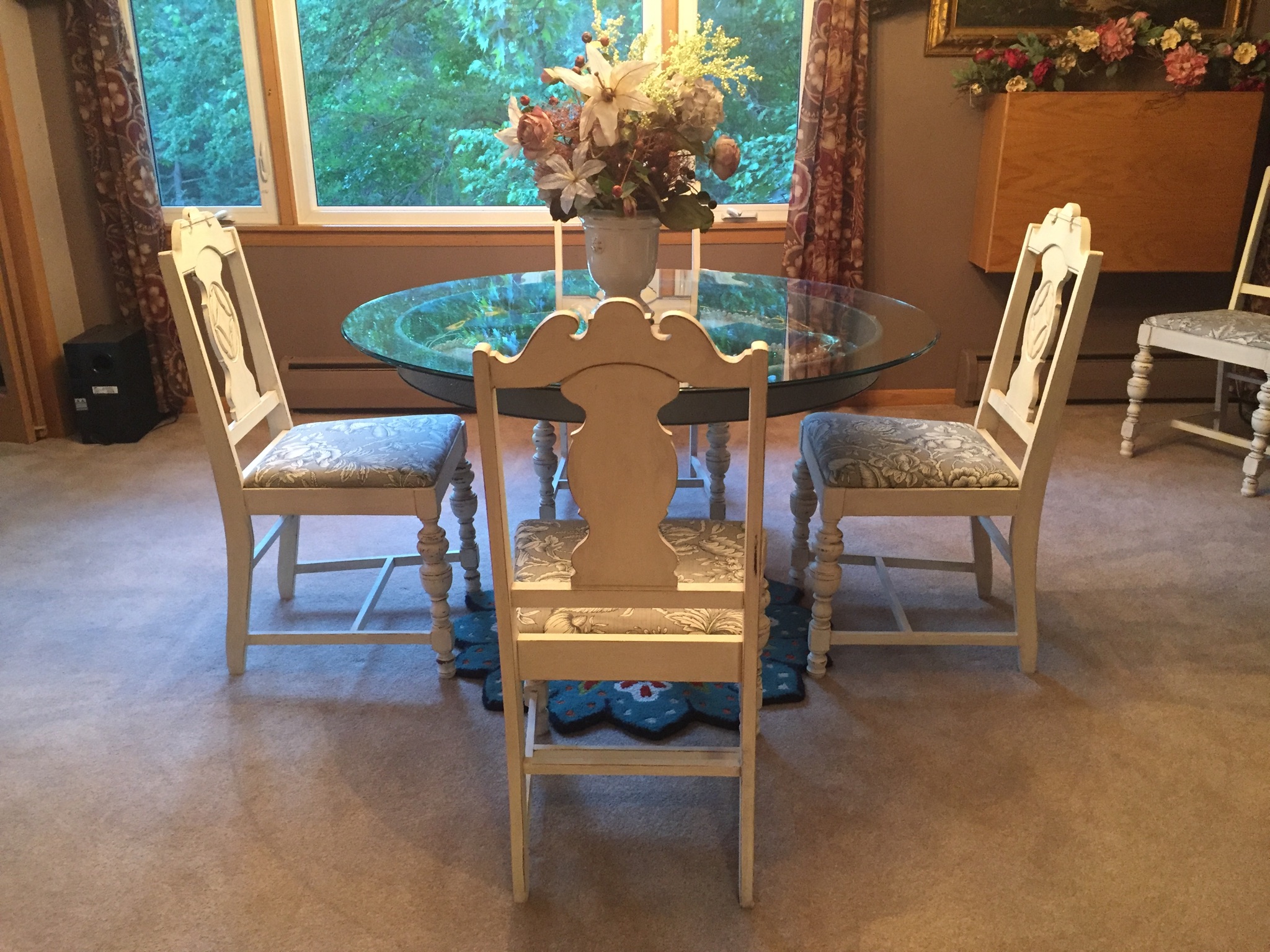 Dave and I did accomplish one of the things we hoped to accomplish with the help of our neighbor today. We were able to bring in our table that I have been painstakingly painting. It turned out very nice. It is very heavy and we could not have moved it into the house without help. And now the garage will be available for cars while we are gone. I took a few photos of how the finished table looks in the house. Remember, it is not a conventional dining room table, especially for a formal dining area. But all said and done, we all agreed that it looks quite nice. It is sort of whimsical and elegant at the same time. I have already made a display in the well area of the table. I’ll publish a few pics for you to see. We set 4 of the chairs around it to see how it looked. The seats have not yet been reupholstered but everyone that sees them has told me not to do so as the color on the seats go well with the table. It feels good to be finished with this project before we leave and before winter sets in.