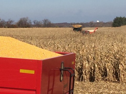 This morning as I drove to the end of the street at the top of the hill from our house I saw a beautiful sight. I always love the view I see as I come to the stop sign to turn onto the road that takes me to the apple farm and the gym where I work out. Every year there are rotating crops planted that change week by week. This year corn was planted. Last year it was soybeans. The corn was in the process of being harvested. The machines are huge and seriously scary looking. Standing in the field by the side of the road a truck patiently waited to be filled with the harvested corn. The harvester goes down the long rows of corn stalks, picks the corn, shucks it, and takes the kernels off the cob, all in one fell swoop. As the corn is processed through the harvester it comes out a shoot and fills up a large compartment. When the compartment gets full, the harvester comes over to the waiting trailers and transfers the corn. Well, as I approached it I could see one trailer was already full and I had the advantage of being higher than the truck as the field was below the road. I only had my cell phone with me but I couldn’t let the beautiful sight of the corn being harvested left uncaptured. Besides, my first thought was that I wanted to share the picture on my blog. I’ll post it below. I just love all the beautiful sights I see every day and wish I could share them with the world. The camera never does them justice.