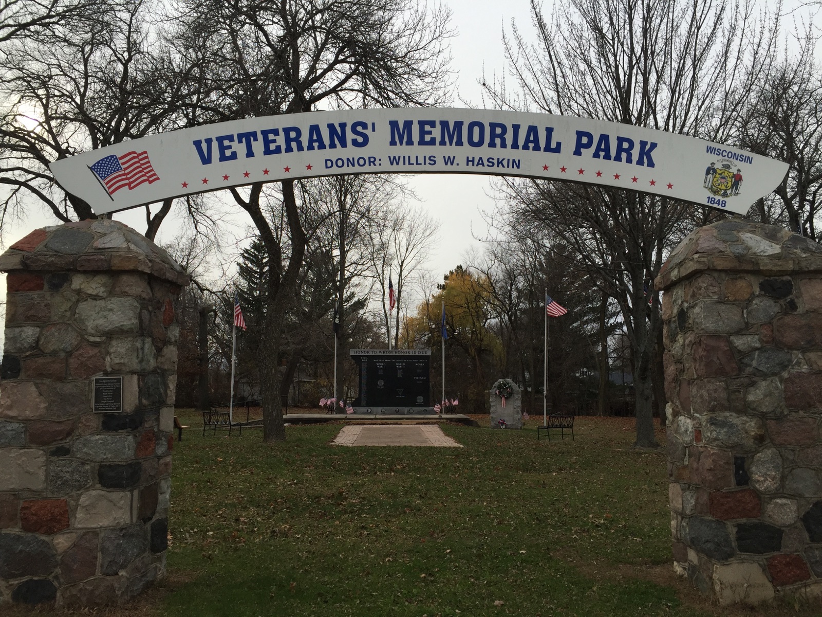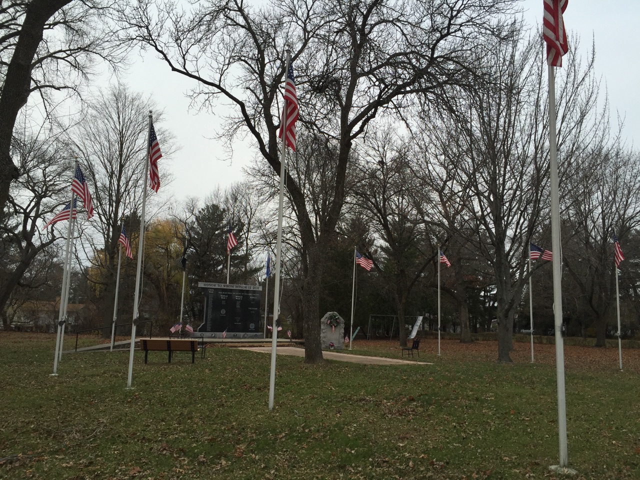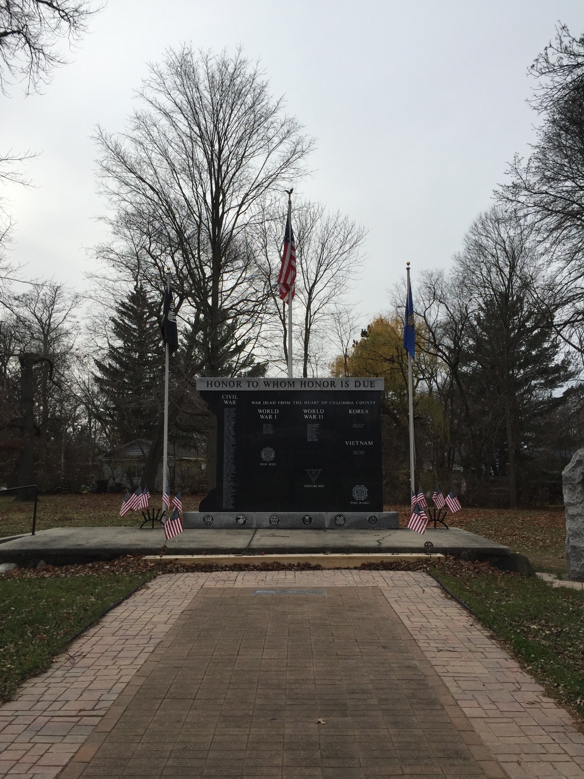 On the way home from the Country Store we passed through a little town called Pardeeville. I really like that little town. It is the same place where we purchased our used dining room chairs for the table we reconditioned this summer. It has a very small home town feeling. Off to my right as we were going down main Street I saw a Veteran’s Memorial Park. Dave turned around so I could go investigate, biting wind and all (I was dressed for it). It was such a beautiful memorial to the citizens of that town that lost their lives in the wars. There were 80 names from the Civil War, 8 from World War I, 14 from World War II, 3 from the Korean War, and 3 from the Vietnam War. I assume the memorial has been in place since before all the Mideast wars we’ve been involved in because there were no other names on the wall. There was a bench with one veteran’s name who died in Pakistan in 2010. What a great sacrifice from one small town. The current population is 2100 people. In 1870 the population was 205.