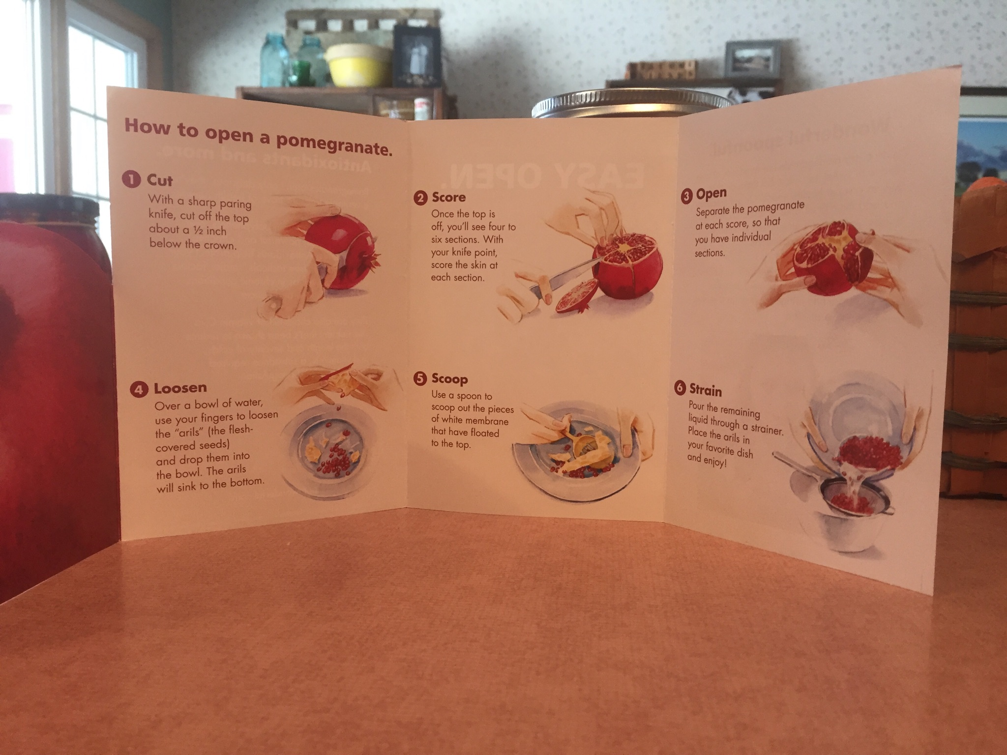 Next on my agenda is to prepare my pomegranate by deseeding it so I can make it into a salad tomorrow. My pomegranate salad recipe was given to me by my friends Lana and Tim. Tim is one of the most excellent creators of delicious foods. Over the years his recipes (most of them originally his) have become tried and true staples on our table. Back to the pomegranate. Just in case you don’t know it, not only are pomegranates a work of art unto themselves, but it is a work of art to deseed them without causing damage to each little seed. I just went into my kitchen and dug out the instruction pamphlet on how to “do it properly”. I took a picture that you can enlarge so that you can see how to deseed a pomegranate. Over the years I have revised the instructions on how to deseed a pomegranate to better suit me. For starters I don’t cut into the seeds themselves, but just barely cut off the top. I also cut a small portion of the bottom off. I do score it on the ridges of seeds and in the valley of the seeds on the outside of the peel. I cut a little niche out of the center top that is open so my thumb can grab hold and pull it apart as it breaks into several sections. I deseed section by section. Use your thumb to gently push against the direction the seed grows. It takes 12 to 15 minutes for me to do an entire large pomegranate.