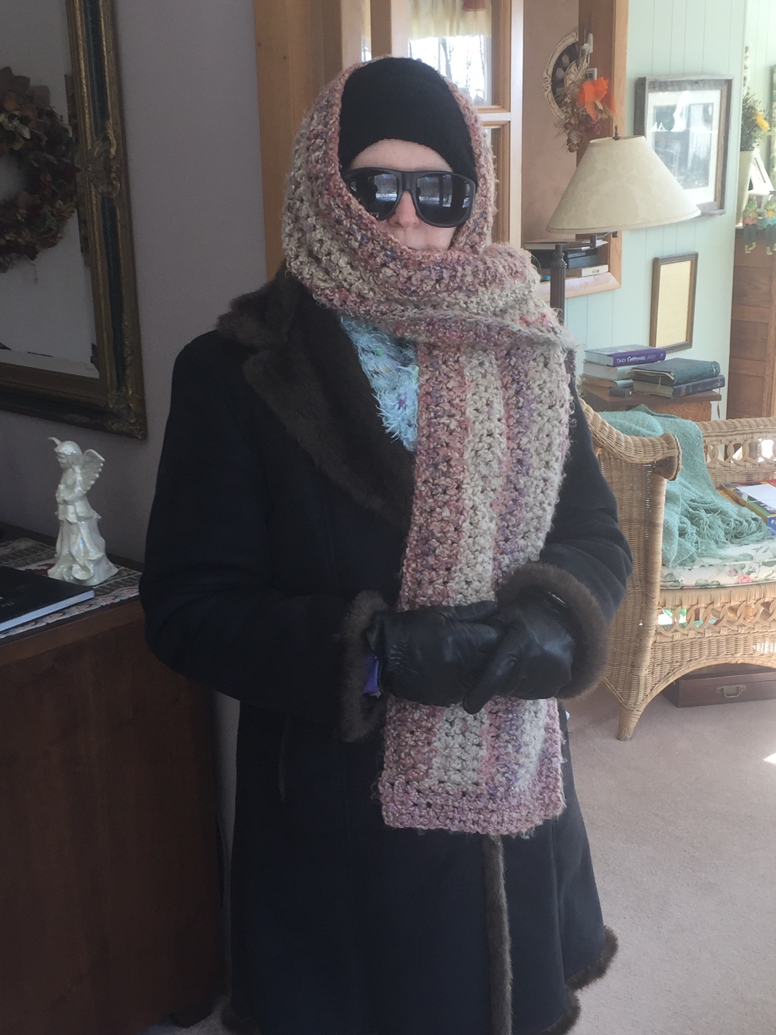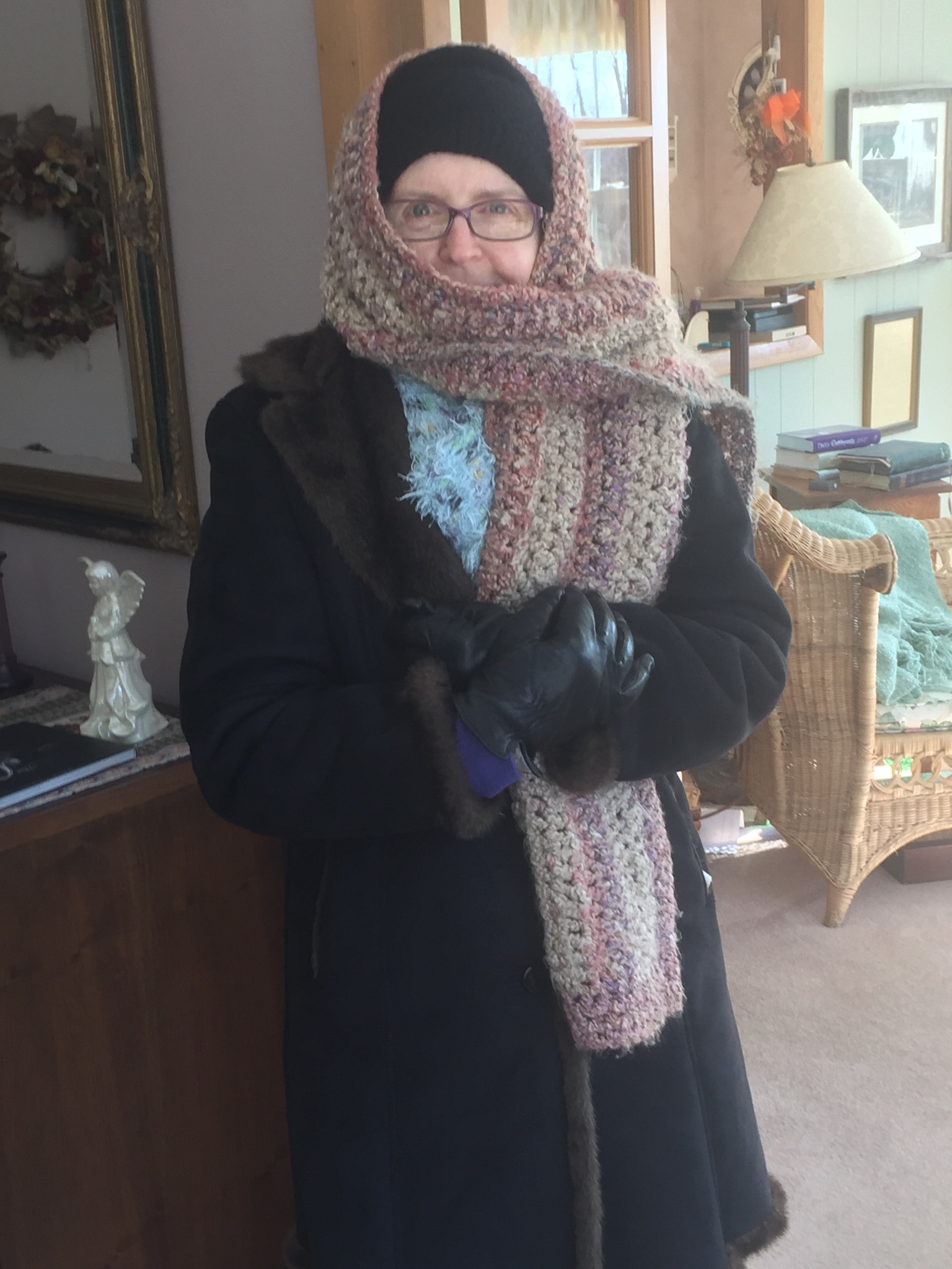 This morning it was minus 7 degrees outside when our post toasty bodies emerged from beneath our pile of quilts. It almost felt that cold inside too. News from the weather channel quoted the wind-chill made it feel as if it was minus 20 degrees. I have the heat up to 72 degrees in the living area, and 62 degrees in the bedroom wing. Downstairs is also set at 62 degrees. We cannot leave the heat off during this kind of cold for fear of pipes freezing. We have a large shop off our family room downstairs and lots of pipes, for our baseboard water heating system, that go through that area. That area is not heated. Because of the pipes being warm the shop does not freeze. The space is 40 feet by 20 feet. To show you how you must dress to go out in this kind of weather, I will include a picture of me still bundled up when we arrived home from the gym earlier today. It takes about 30 minutes for the car heaters to be able to start pumping out heat so we must really be bundled when we get into the below freezing car. We have wool blankets in the car that I snuggle in.