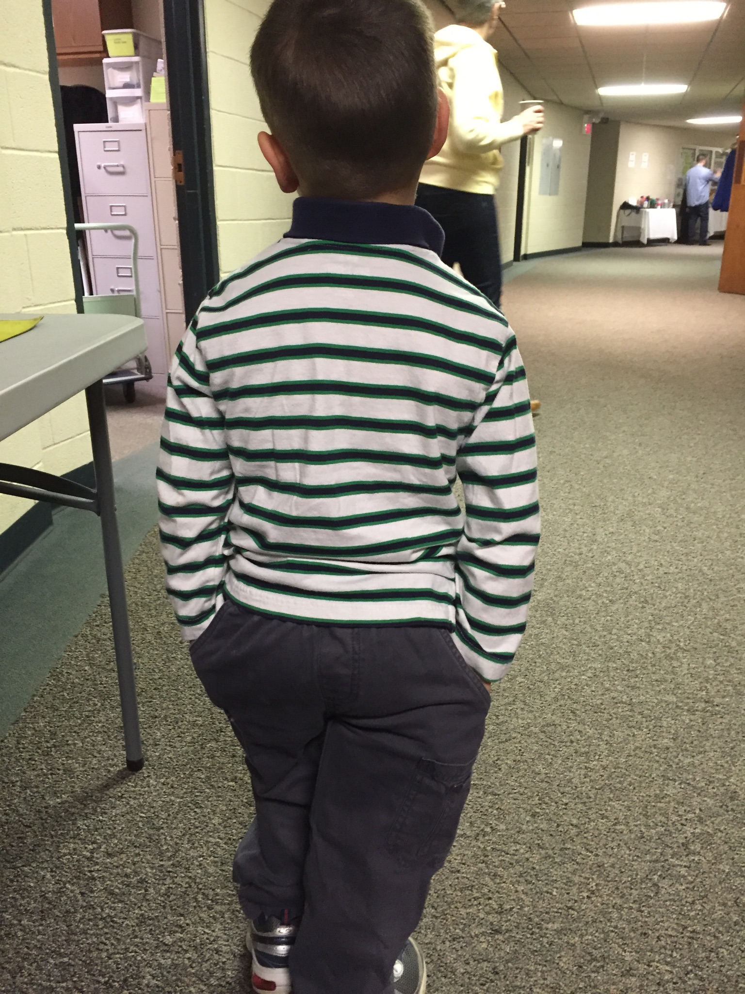 Now to the mistake. I needed to brush my teeth after breakfast and Xander needed to get dressed. Well, he only had one pair of clothing in his bag to put on, so I instructed him to get dressed, remembering to remind him to change his underwear, and I would be right out. Once he was dressed he came into the bathroom to comb his hair (he has a buzz cut), I finished my teeth brushing, and we left to go to church. He looked quite handsome in my book. I dropped him off at his 4 year old class. Fast forward to the service ending, me picking the boys up from their respective classrooms, and finding mom and dad amidst the hundreds of parishioners. All is well until we see Xander walking away from us with his hands in his “back pockets”. EXCEPT…his hands were in his front pockets which now graced his little butte. I have a picture of that for you too. He was so humiliated when he found out he had his pants on backwards! Actually, I thought it quite cute! Well, dad took him to the restroom and saved his dignity. He came out a happy camper. So much for Gramma’s eagle eye. Next time I’ll have to give him a better onceover before we leave home. I guess ALL’S WELL THAT ENDS WELL! He still loves me. And I thought I had done a great job just making certain he had on underware!
