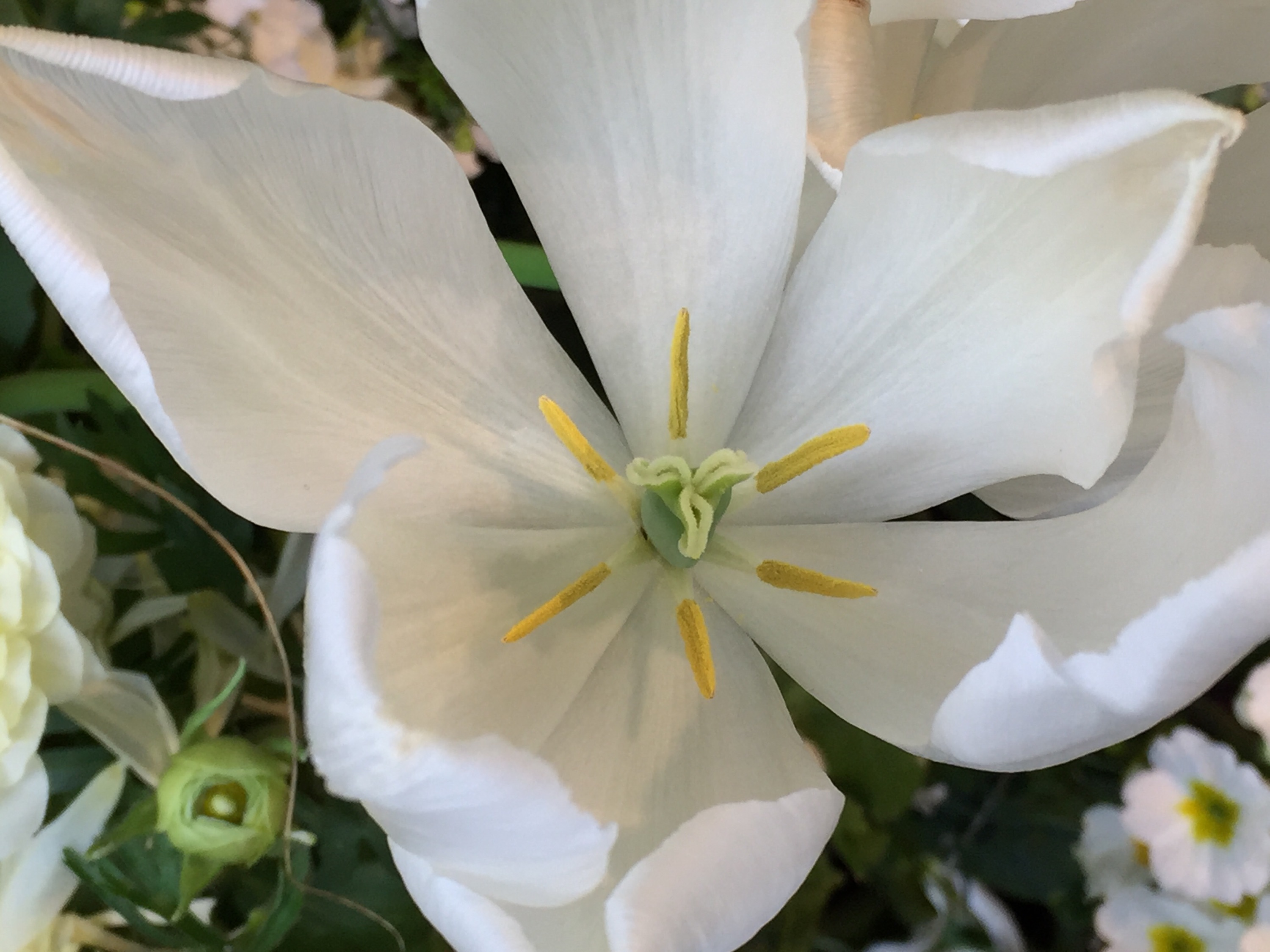 On the way home from the editing class Dave and I stopped at Olbrich Botanical Gardens for their pre-spring flower show. We almost missed the show as tomorrow is the final day. Olbrich’s displays are always unique, colorful, and artistically presented. This year was no exception. Having left my phone at home, I borrowed Dave’s cell phone and took several pictures (about 45). Dave, being about a foot taller than me had a totally different perspective from my closer to the ground view. He pointed out several different arrangements for me to photograph because he thought I might miss some of the things he could see that I could not. And he was right. One such perception was a group of white tulips that had bloomed wide open and exposed their centers. I could not see them without a bit of effort. But I managed a few peeks when he pointed out their exquisiteness which was revealed due to the fading petals. They were past their prime. Their hours were numbered. Even in this end state there was still so much beauty being exposed from deep within.
