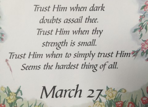 I must explain the above poem. When we received our information from Airbnb.com regarding our reservation we were only given the name of the subdivision of our designated location. We found the location of the subdivision through google. We thought perhaps it was the only house as the location was named BOYER FARMS, only to find out that there were dozens and dozens of houses that all looked quite similar. I called, left messages to the owner but we did not receive a response. After an hour of searching up and down the streets, stopping strangers on the street to ask them if they recognized the picture of the house on my cell phone which I received from Airbnb, knocking on doors which had porch lights burning, we were still house-less. So I scrutinized the picture of the house to see if I could figure out what might be different from the others in the neighborhood. Finally, I discovered a design difference in the walkway that led up to the front door that no other house had. So, I kid you not, (after stopping at a construction site so I could use an outdoor latrine with my cell phone flashlight) we examined each house in order to find the nuance the picture characterized. Would you believe it, we actually found it. It had no porch light burning and only one light was on in the house. By this time it was almost 9:00 p.m. I have used Airbnb on many occasions but it was Dave’s first experience. Not a great first experience for him. The lightbulb on the porch had burned out. There is a lot more I could tell you but I will refrain. So now you know what the poem is referring to. There is even more to the story. Maybe someday I will tell you about the bed. I am smiling and I am still learning. Wherever I go God so graciously teaches me something.